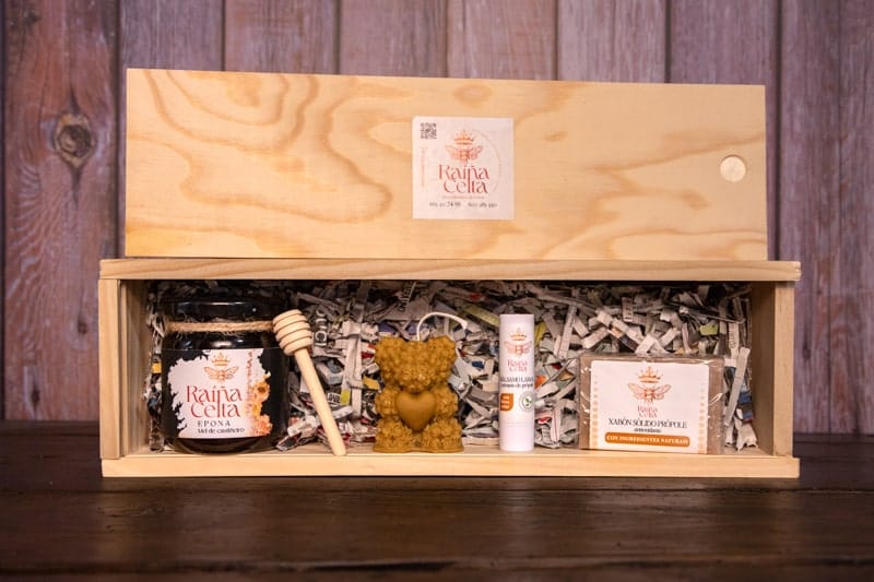 Nuestra caja regalo más variada para quienes lo quieren todo. Una selección completa de nuestros productos artesanos: miel de castaño, vela de cera pura, jabón natural y bálsamo labial, presentados con cariño en su caja de madera.