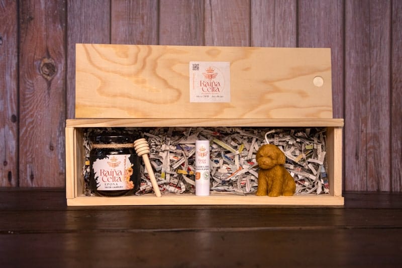 Un detalle muy completo que combina el sabor de nuestra tierra con el cuidado natural. Este pack incluye un tarro de miel de castaño, una vela de cera pura y miel y un bálsamo labial protector, todo presentado en su caja de madera.